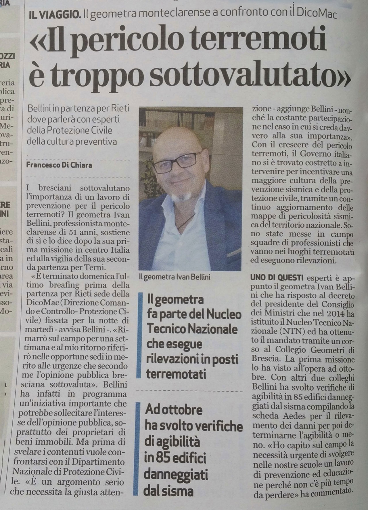 Il rischio sismico è un tema spesso sottovalutato, ma la consapevolezza e la prevenzione possono fare la differenza. Il geometra monteclarense Ivan Bellini, membro del Nucleo Tecnico Nazionale, è in prima linea in questa battaglia. Dopo una prima missione nei territori colpiti dal terremoto in centro Italia, è pronto a partire per Rieti, dove si confronterà con esperti della Protezione Civile per analizzare le criticità e proporre soluzioni.